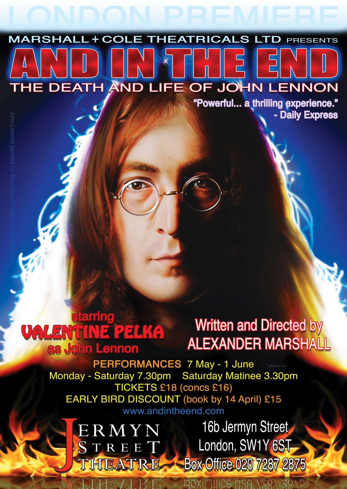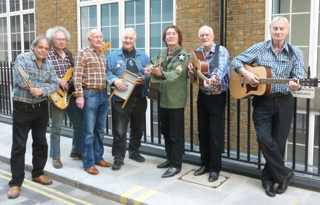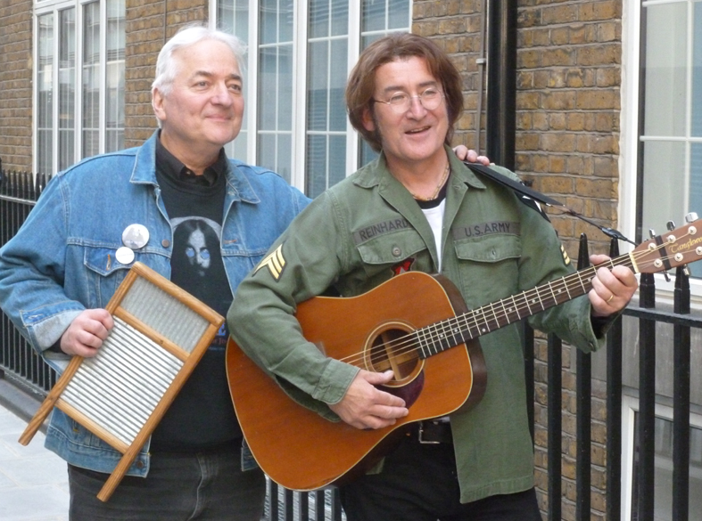 On Monday 6 May the Quarrymen played a gig at the St James Theatre Studio in London to celebrate the London premiere of a play about John Lennon, “And in the End” by award winning American author Sandy Marshall. During the sound check the “Evening Standard” sent along a photographer to take some shots of Val Pelka, the actor playing Lennon, in costume and on stage with the Quarrymen which featured in the newspaper the following day The lineup was an unusual one for the Quarrymen in that whilst Len Garry, John Duff Lowe and Rod Davis were there, drummer Colin Hanton was recovering from an operation on his shoulder and so David Stark and Marko Laver, both members of the “Trembling Wilburys”, sat in on drums and bass respectively and risked their musical credentials! It turned out to be a great gig with a very appreciative audience in a superb venue! Val Pelka also took the stage in his Lennon outfit, and so convincing he looked that many of the audience made the decision there and then to go and see him in the play.