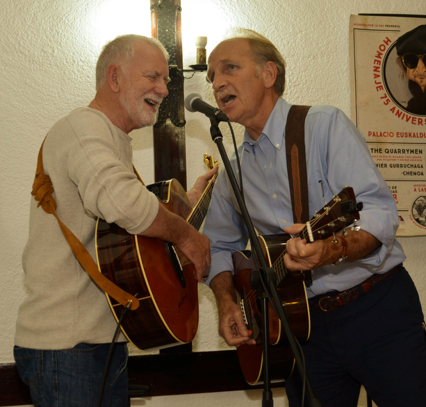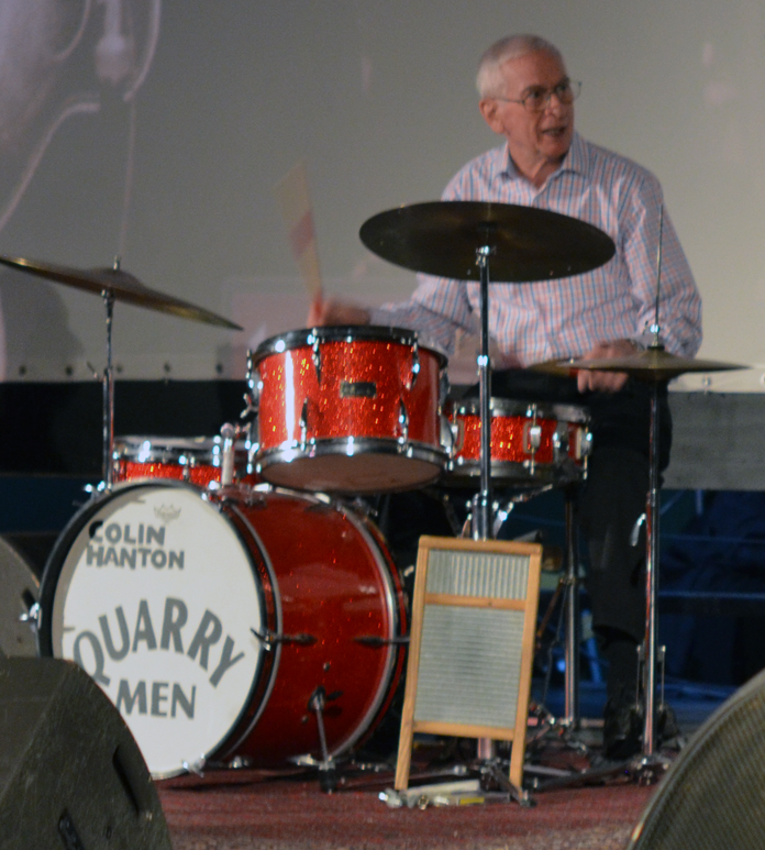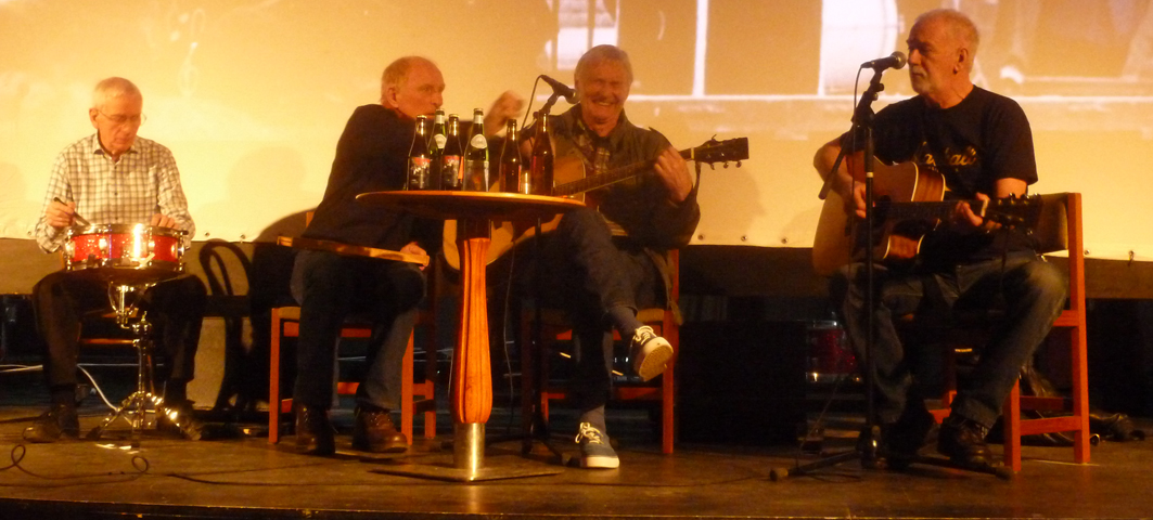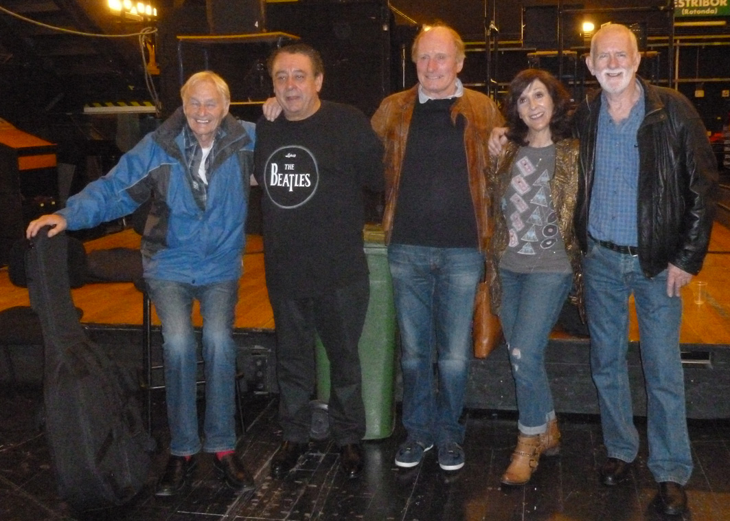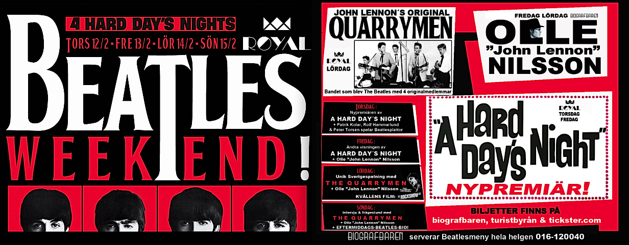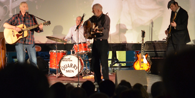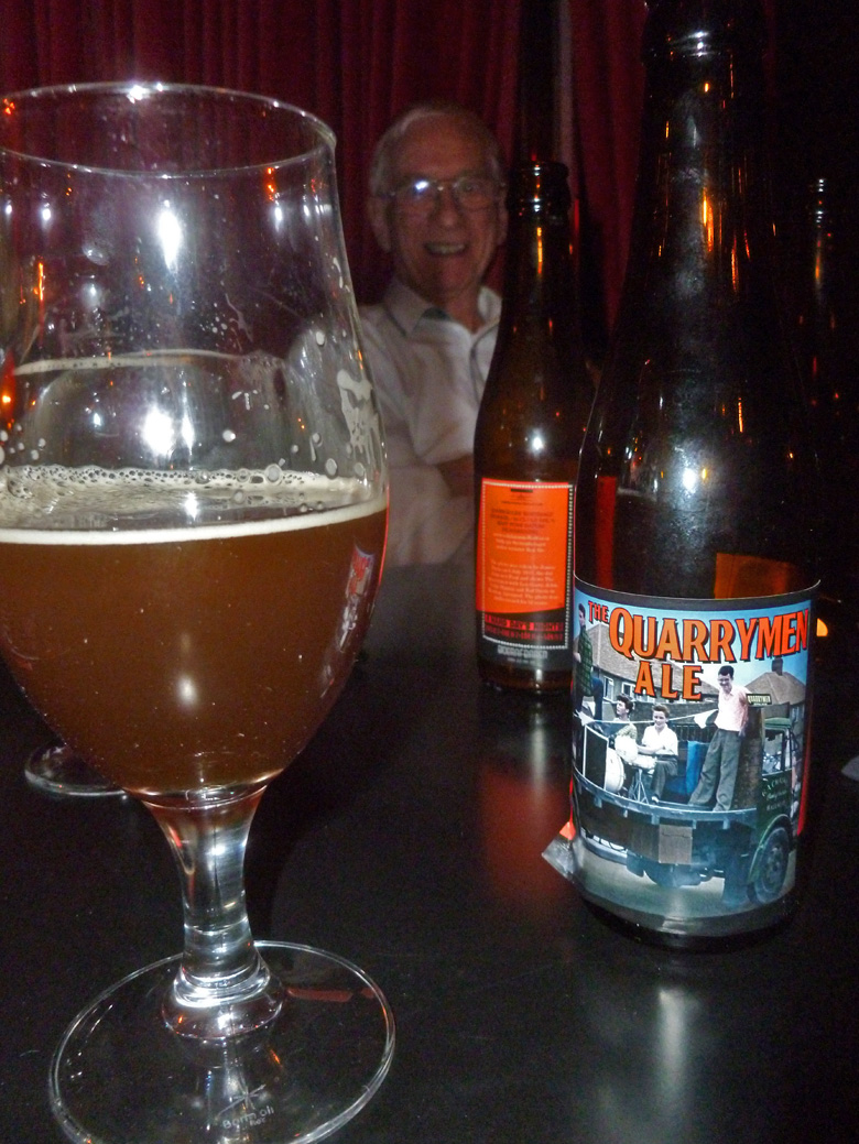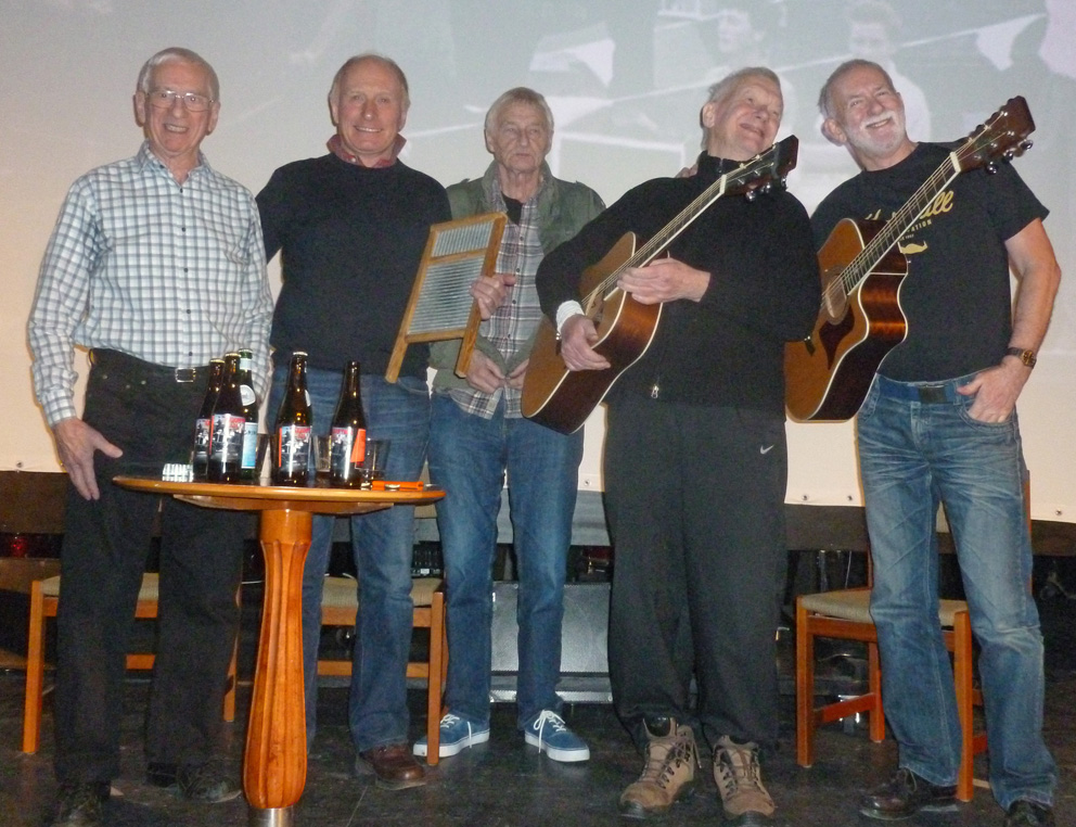 On 13/14 15 February the Quarrymen appeared in Eskilstuna, Sweden at the Beatles Weekend held in the Royal Biograph Cinema. They played a 90 minute set on the Saturday evening followed by a Q and A session on the Sunday afternoon. Guest bassist this time around was one of the organisers of the gig, Patrik Kollar, who is the man in the suit in the photo below wearing the John Lennon Quarry Bank tie! A major attraction of the weekend was the “Quarrymen Ale”, specially brewed by the local brewery - see bottle below, and the special Beatles themed menu in the adjoining restaurant, which featured Scouse made to the Liverpool FC recipe. Unfortunately we didn’t get to sample this as it sold out like hot scouse, so we had to stick to the reindeer steak! On stage the Quarrymen were joined on washboard for “Maggie May” by an old friend of Rod Davis’s from the 1960s, Pete Douglas, who was a member of the well-known Leesiders Folk Group on Merseyside. Pete now lives in Sweden and these two hadn’t met for 47 years! Alas they are now a bit more wrinkly than when they last met! Many thanks to Patrik, Peter, Mathias and Rolf for a great weekend! |